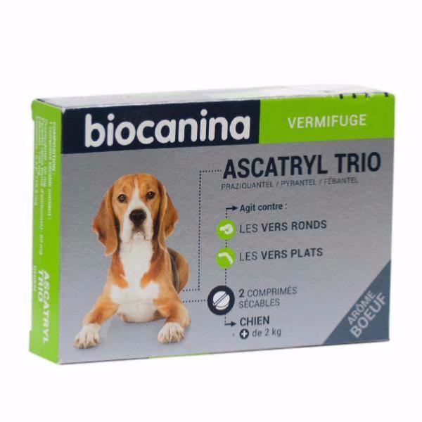 ASCATRYL TRIO CHIEN > 2 KG - BIOCANINA - TRAITEMENT VERMIFUGE CHIEN EN BOITE DE 2 COMPRIMES -